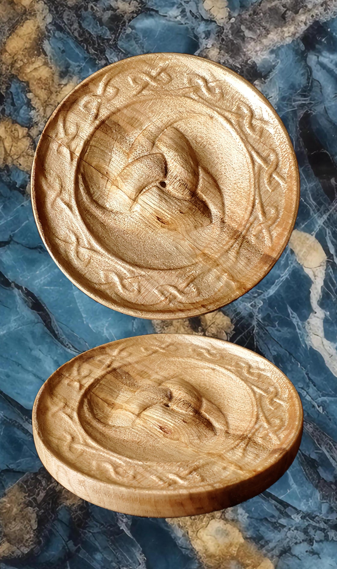 Enhance your environment with these exquisitely designed wooden plates, which are designed for holding incense sticks. Each plate showcases a beautifully carved representation of Odin's symbol, highlighting exceptional craftsmanship. Crafted from premium Maple or Walnut, they have a diameter of 4 inches and a height of 1/2 inch, making them both a chic and practical addition to any space.
